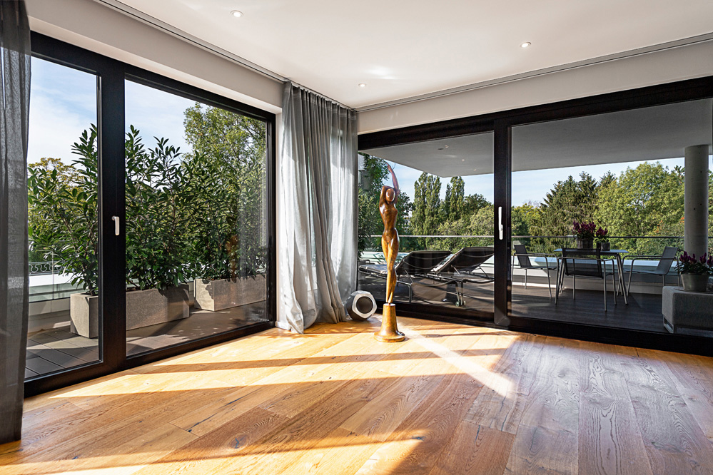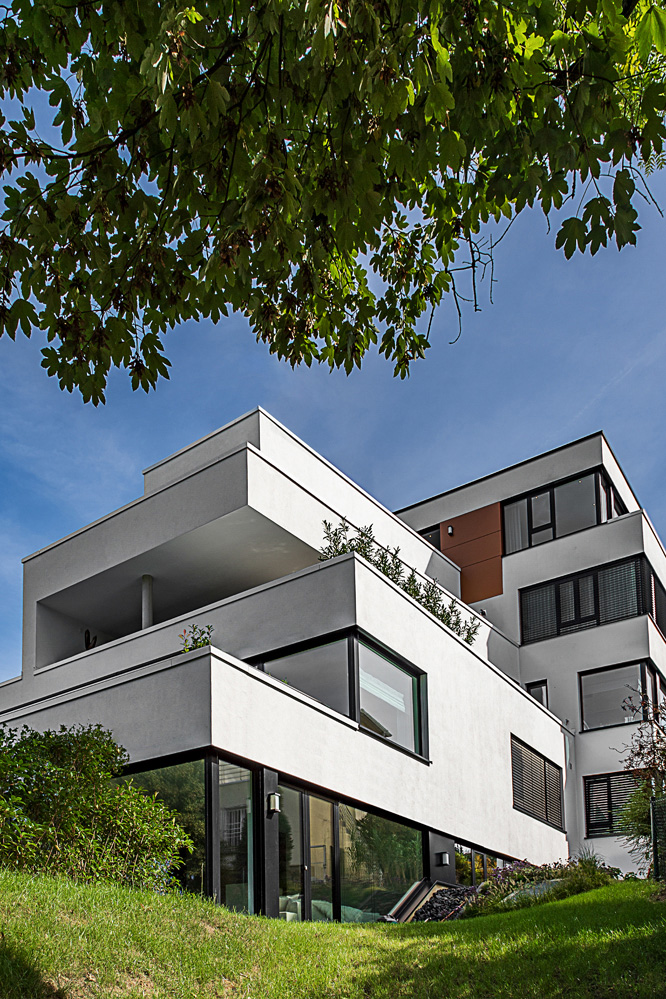 Das neue Gebäude umfasst sechs großzügige Terrassenwohnungen. Jede Etage ist in sich abgeschlossen. Planungsgrundlagen waren ein hoher Anspruch an die Architektur, ein respektvoller Umgang mit dem historisch geprägten Ort sowie der Wille, die individuellen Wünsche der Bewohner zu realisieren – ganz so, wie es sicher auch der Architekt Alfred Fischer im Jahr 1928 bei seinem Entwurf zur originalen Villa Hessberg im Sinn hatte. Dazu ein herrliches, nach Süd-Westen ausgerichtetes Hanggrundstück mit einem fantastischen Blick in das angrenzende Naturschutzgebiet: So konnten einzigartige Lebensräume von ganz besonderer Qualität entstehen.